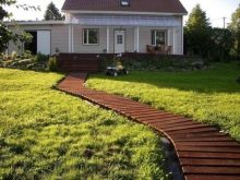 المسارات التقليدية المصنوعة من الخشب في البلاد صديقة للبيئة وغير مكلفة وجميلة. يمكنك استخدام الألواح المتبقية أو المنصات الخشبية من نقل مواد البناء. المنصات ذات عرض كافٍ ، وتتكون الكتل من ألواح معالجة متطابقة. يمكن تمديدها على طول المسار ، لكن عمر الخدمة سيكون قصير الأجل ، وقد تنكسر بعض الألواح وتشكل تهديدًا للإصابة. من الأفضل تفكيك المنصات ، وإعداد الخندق من الحجر المكسر أو الخرسانة ، ووضع الألواح فوق جذوع الأشجار ، وتثبيتها بمسامير ذاتية التنصت ومعالجتها بعوامل خاصة مضادة للتعفن..