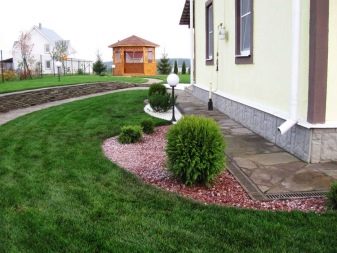 يتم تحديد نظام الألوان لمواد التشطيب في مرحلة التخطيط. هنا تحتاج إلى الاعتماد على الألوان الأساسية للبيئة. سيتطلب المنزل المحاط بالصنوبريات الخضراء الداكنة مسارات حجرية رمادية داكنة أو إبر صنوبر مجففة. يلعب نمط الرصف دورًا مهمًا في الإدراك العام للمناظر الطبيعية. على سبيل المثال ، يمكن تزيين الأكواخ ذات الطراز الريفي بمسارات من الطوب أو الفسيفساء محلية الصنع. سيحب الأطفال المسارات المطاطية الناعمة من الإطارات.