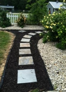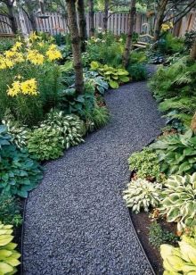 عند ترتيب أسرة عالية ثابتة ، فإن المسارات مغطاة بالركام, وضعت على مادة عازلة الاكريليك الأسود. هذه المادة تعزلهم عن إنبات الحشائش ، بينما تتدفق الرطوبة بحرية في التربة. تبدو مسارات الحصى الصغيرة ممتعة من الناحية الجمالية وتستمر لفترة طويلة. يمكن تزيين المسارات ذات الوظائف المختلفة في البلد بنفس النمط باستخدام نفس المادة ، مع تغيير عرض وشكل المسارات فقط. كل هذا يتوقف على تفضيلات المالكين ، وحجم الموقع وشريحة السعر لأعمال المناظر الطبيعية.