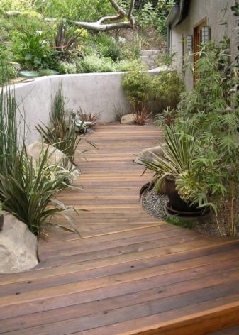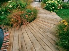 المسارات التقليدية المصنوعة من الخشب في البلاد صديقة للبيئة وغير مكلفة وجميلة. يمكنك استخدام الألواح المتبقية أو المنصات الخشبية من نقل مواد البناء. المنصات ذات عرض كافٍ ، وتتكون الكتل من ألواح معالجة متطابقة. يمكن تمديدها على طول المسار ، لكن عمر الخدمة سيكون قصير الأجل ، وقد تنكسر بعض الألواح وتشكل تهديدًا للإصابة. من الأفضل تفكيك المنصات ، وإعداد الخندق من الحجر المكسر أو الخرسانة ، ووضع الألواح فوق جذوع الأشجار ، وتثبيتها بمسامير ذاتية التنصت ومعالجتها بعوامل خاصة مضادة للتعفن..