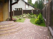 يبدأ تحسين منطقة الكوخ الصيفي بتصميم المنطقة الأمامية. تستخدم أفضل المواد الزخرفية في زخرفة الفناء. المسار من البوابة إلى الشرفة هو بطاقة العمل الخاصة بالمالكين.