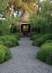 - للتسجيل في الموقع بأسلوب البحر الأبيض المتوسط اختر الحصى والبلاط والرمل. تمتزج موسيقى الريف بشكل مثالي مع الأرضيات الخشبية الطبيعية. تم تزيين مناطق الغابات بمسارات مصنوعة من الحجر والحصى وقطع الخشب. يبدو من المثير للاهتمام استخدام اللحاء المسحوق في ردم المسارات.