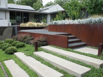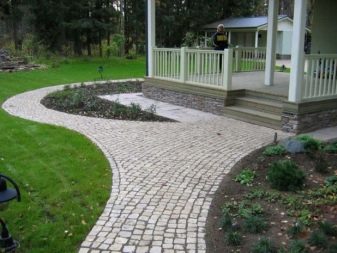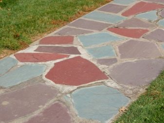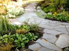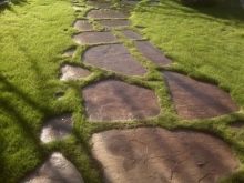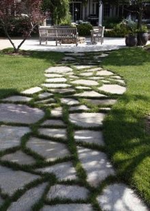 هناك عدة أنواع من الحجر الطبيعي: لائحة ، كوارتزيت ، جرانيت ، حجر رملي ، شونجيت. يخلق الحجر على فترات مملوءة بعشب العشب انتقالًا دافئًا ومريحًا عبر المنطقة. تشمل عيوب هذا الرصف التكلفة العالية للمادة. بالنسبة لخيار الميزانية ، من الأفضل استخدام ألواح الرصف..