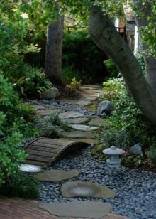 الحجر الطبيعي له أهمية كبيرة. الحجر له معنى فلسفي عميق وهو رمز للتصميم العرقي المميز. الحديقة بأكملها أو قسم منفصل منها مزين بالنباتات المناسبة. المسارات لها منحنيات ناعمة ، السطح مزين بالحصى والأنقاض والصخور المسطحة.
