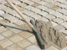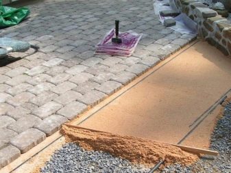 بعد ذلك ، اسكب الماء حتى يملأ الرمل الفراغات بين الأحجار جيدًا.. بعد التجفيف ، رشي الرمل مرة أخرى بطبقة 5 سم ، متبوعة بطبقة من خليط الأسمنت والرمل (5 سم). يتم وضع مادة التشطيب (الحجر الطبيعي أو الطوب أو الألواح) على هذه الطبقة. يتم صدمها وتغطيتها بمزيج من الأسمنت. انسكب بالماء وأعد تعبئته بمزيج الأسمنت حتى الوصول إلى مستوى التسوية المطلوب.