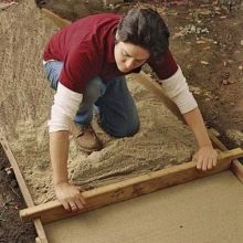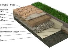 يُسكب الرمل في الأسفل في طبقة 5 سم للأسطح الصلبة والناعمة. إنهم يصطادون ويتحققون من الأفق وينحدرون مع المستوى. بعد ذلك ، يُسكب الحجر المسحوق بسمك طبقة من 5-10 سم ، ويمكنك الجمع بين هذين المكونين وملء الجزء السفلي على الفور بمزيج من الرمل والحصى. ويلي ذلك طبقة أخرى من الرمل بسمك 5 سم ، ويجب أن يُسلق كل شيء جيدًا بالماء ويترك ليجف لعدة أيام. أخيرًا ، يتم إجراء فحص نهائي للمستوى وإضافة الرمل في الأماكن المطلوبة – والقاعدة جاهزة..