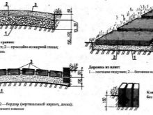 يتم تسوية الجزء السفلي من الخندق وفحصه على مستوى المبنى حتى لا توجد ثقوب وانتفاخات. من الضروري مراقبة المنحدر العام لمسار تصريف المياه (5 درجات). إذا كان هذا المنحدر غير ممكن ، فقم بتوفير منحدرات قطعة القماش من مادة التشطيب على الجانبين (من 5 إلى 15 درجة). يتم حشو الجزء السفلي من الخندق بسجل بقضيب مسمر أو دك ميكانيكي.