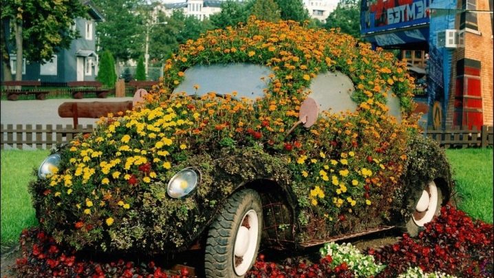 لإنشاء تركيبة غير عادية ، اصنع إطارًا سلكيًا على شكل سيارة أو طائر غير عادي أو قوس قزح. يمكن تثبيت هذا الهيكل في جزء معين من الحديقة أو صنعه على شكل حديقة أزهار متنقلة..
