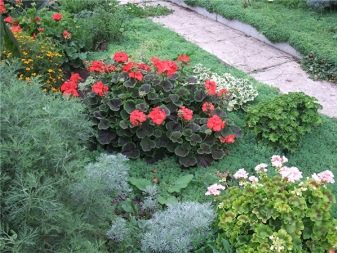 - الجيرانيوم (Pelargonium) لها أزهار كبيرة وأوراق حمراء جميلة. ينمو في الظل الجزئي ويتم دمجه مع النباتات المعمرة الأخرى. يستمر الإزهار من مايو إلى يونيو.