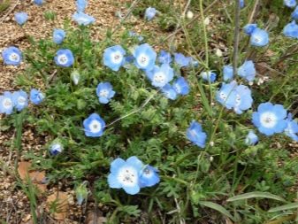 - Nemophila. يتميز النبات بارتفاعه المنخفض – حتى 25 سم ، والأوراق المخرمة لها حواف منقوشة جميلة. تستخدم الزهرة لأسرة الزهور والحدود وتتحمل بهدوء الشتاء بدون مأوى.