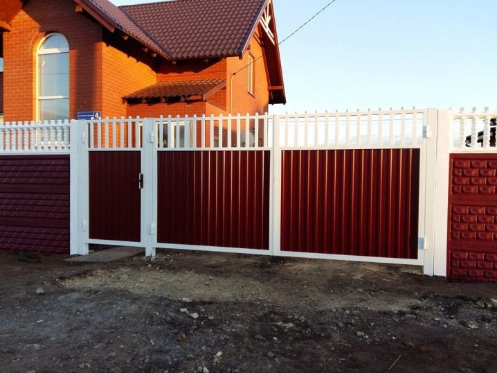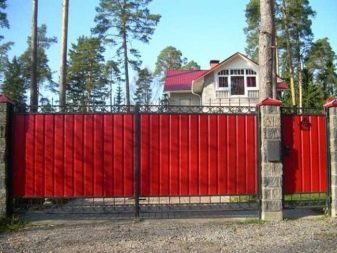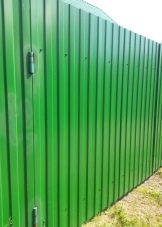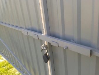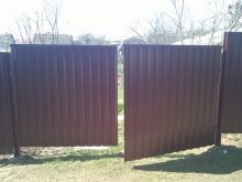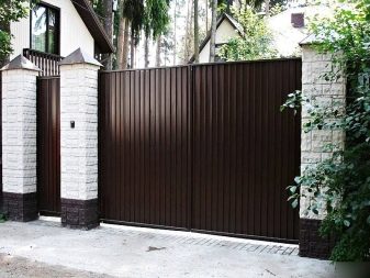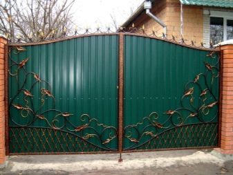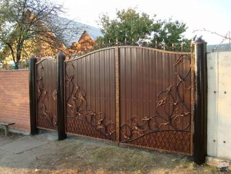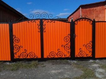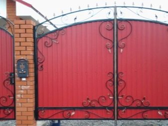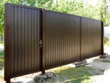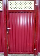 إذا كان سقف منزلك مغطى بألواح معدنية ، فستبدو البوابة من نفس اللون جيدة.. يمكن ربط الصفائح من خلال موجة واحدة بالإطار نفسه وبالتعزيزات. إذا كانت ورقة واحدة لكل باب غير كافية ، فيجب أن تتداخل الألواح على بعضها البعض بموجة واحدة. يمكن إغلاق الأبواب ، إذا رغبت في ذلك ، مع التزيين على كلا الجانبين – من الشارع ومن الفناء.
