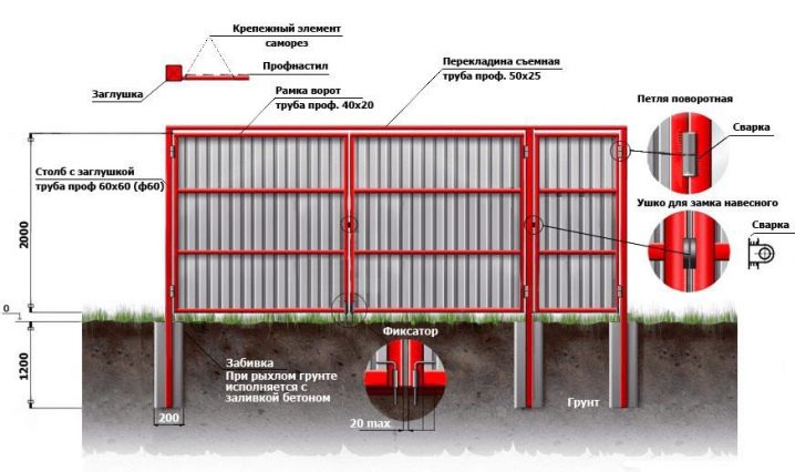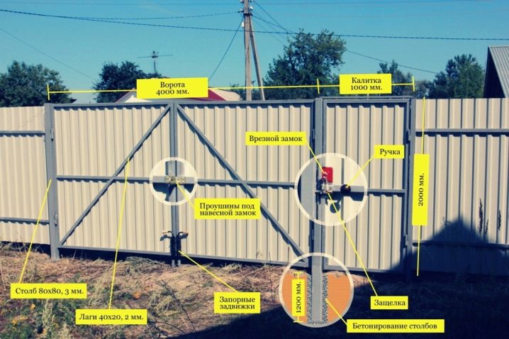 في أغلب الأحيان ، يتجاوز عرض الفجوة في البوابة 4.5 متر ، وفي الويكيت – 1.2 متر. في الارتفاع ، غالبًا ما تكون مساوية لحجم الورقة وتعتمد على ارتفاع السيارة. لا تنس أن تأخذ في الاعتبار المسافة من الأسفل ، فهي تعتمد على المنطقة المناخية لهذا الموقع (كمية الرواسب الصلبة في الشتاء), بحيث تفتح البوابة بحرية وتتراوح من 0.15 الى 0.3 م. من الأعلى يمكنك تزيين الهيكل بالديكور.