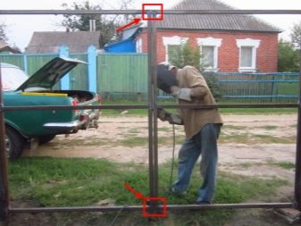 المفصلات ملحومة مبدئيًا بعمود الدعم ، ثم بالإطار ، وتتراجع من نهاية الإطار بمقدار 0.2 متر. يعتمد موقع المفصلات على كيفية فتح الأبواب.. إذا قمت بتثبيتها مباشرة بالإطار ، فإن الباب يفتح على جانب واحد. وإذا قمت بتثبيتها بالقرب من الدعم ، فسوف تفتح للخارج والداخل. ثم, حتى لا تتدلى الهياكل وتفسد السياج ، ضع حدودًا. يتم لحام ثلاث حلقات بحلقات ثقيلة على كل جانب ، وإلا تكفي اثنتان.