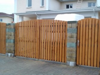 البوابات الخشبية جميلة ولكنها أقل متانة ويصعب صيانتها. لكي تكون أقوى ، من الضروري اختيار ألواح البلوط على الأقل ، وهذا ليس رخيصًا. يمكنك بالطبع صنعها من سكة حديدية وحانة وسياج اعتصام ، لأن هذه مادة رخيصة إلى حد ما.. على أي حال ، يجب معالجة الأجزاء الخشبية من الآفات الخشبية والعفن والنار. باستخدام منتجات مطهرة و برايمر و حماية من الرطوبة. ثم يجب رسمها أو تلميعها في طبقتين..