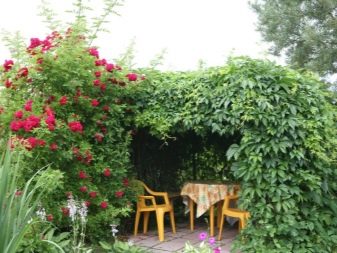 بالإضافة إلى الزهور منخفضة الترتيب ، يمكن أيضًا استخدام الشجيرات المزهرة. على سبيل المثال ، الياسمين ، الليلك ، أو حتى القفزات. سيخضر أحد الجدران بأوراقه الخضراء.
