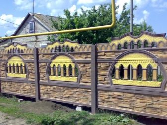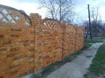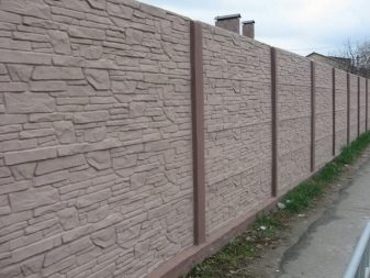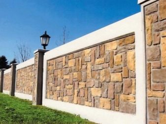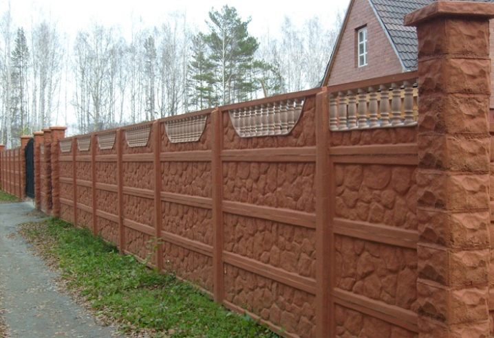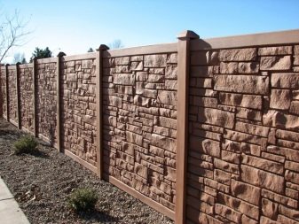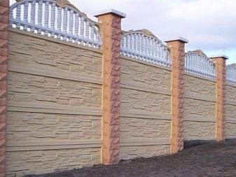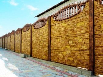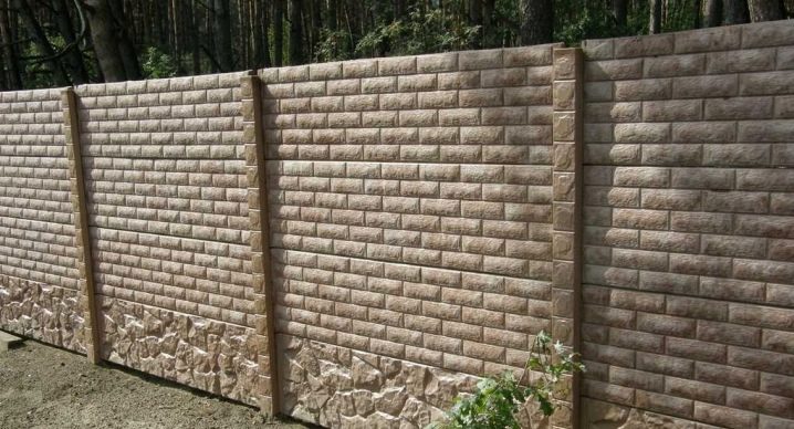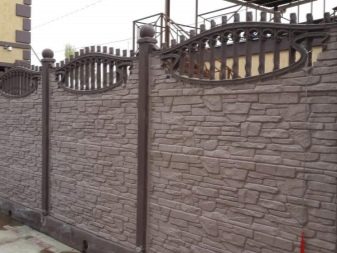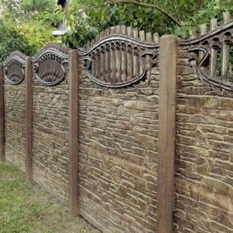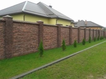 نوع من السياج الخرساني مع تشطيب يقلد البناء بالطوب. الأجزاء السفلية مصنوعة على شكل حجر طبيعي. يبدو هذا التصميم تمثيليًا للغاية في أي منطقة ضواحي..