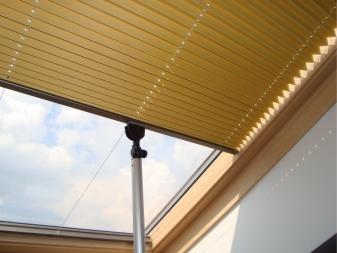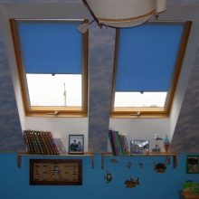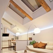 غالبًا ما تكون ستائر السقف هي الحل الوحيد الممكن للنوافذ المائلة ذات الشكل غير القياسي. يتميز هذا الخيار لتزيين فتحات النوافذ بتصميم أكثر تعقيدًا ، ولكن بفضله يظل مائلًا ، ولا يتجعد ، ولا ينزعج ، ويحمي بشكل موثوق من الضوء غير المرغوب فيه ، أو على العكس من ذلك ، يسمح لك بتوجيه تدفق الضوء في الاتجاه المطلوب.