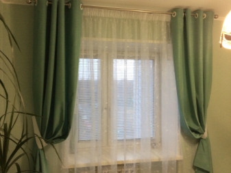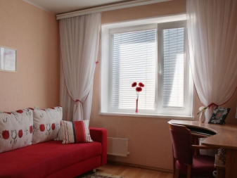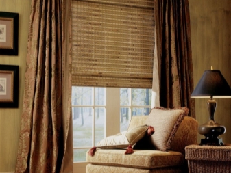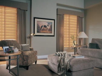 غالبًا ما يتم دمج الستائر الأفقية في غرفة المعيشة مع الستائر الكلاسيكية. في هذه الحالة ، لا ينصب التركيز على الملمس أو الرسم المثير للستائر ، ولكن على قدرتها على حماية الغرفة من أشعة الشمس. يتم اختيار لون الرقائق في نفس الظل مثل البيئة ، ولكن نغمة واحدة أغمق. نتيجة لهذا ، لا تندمج النافذة مع الجدران. غالبًا ما يتم اختيار نماذج النسيج لغرفة النوم ، مع استكمالها أيضًا بالستائر الكلاسيكية. غالبًا ما يقع الاختيار على الطرز ذات الرقائق العريضة. إنها تحمي جيدًا من الضوء ، وفي نفس الوقت تجعل الغرفة أكثر راحة. باختيار الستائر لتتناسب مع لون الستائر ، ابتكر المصمم ثنائيًا رائعًا لتزيين النوافذ.