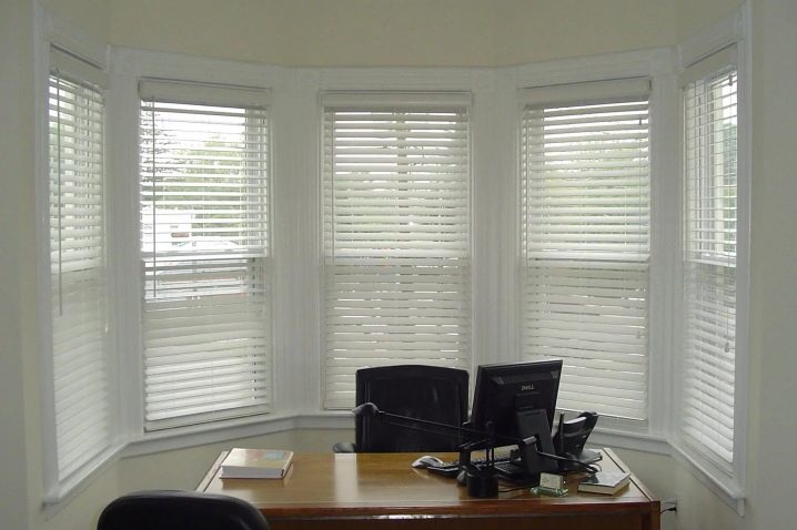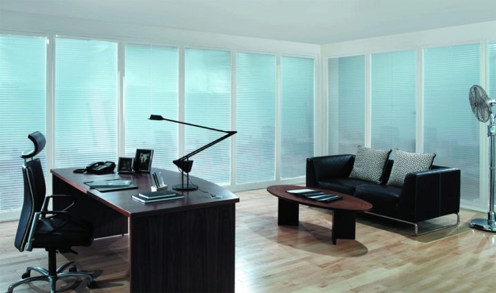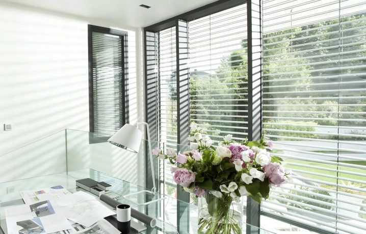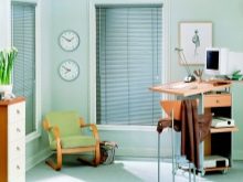 بالنسبة للمكتب ، فإن الخيار الأفضل هو الستائر الأفقية فقط. فهي لا تشتت الانتباه عما يحدث بسبب تصميمها البسيط ، كما أنها تحمي مكان العمل بشكل موثوق من أعين المتطفلين ، والشاشة من الوهج ، والبيئة العامة من الإرهاق.