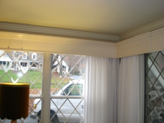 يعتبر الكورنيش البلاستيكي الأكثر بساطة مع شريط قياسي مثاليًا لتزيين نوافذ الزاوية البانورامية. يمكنك أن ترى أن إفريز الملف الشخصي يتم تجميعه من عدة أجزاء. هذا النوع فقط هو القادر على توفير انحناءات زوايا سلسة ومتساوية. كان الرفض الكامل للديكور فكرة جيدة ، مما سمح لك بالتركيز على المنظر الرائع من النافذة..