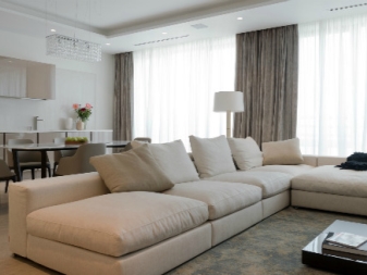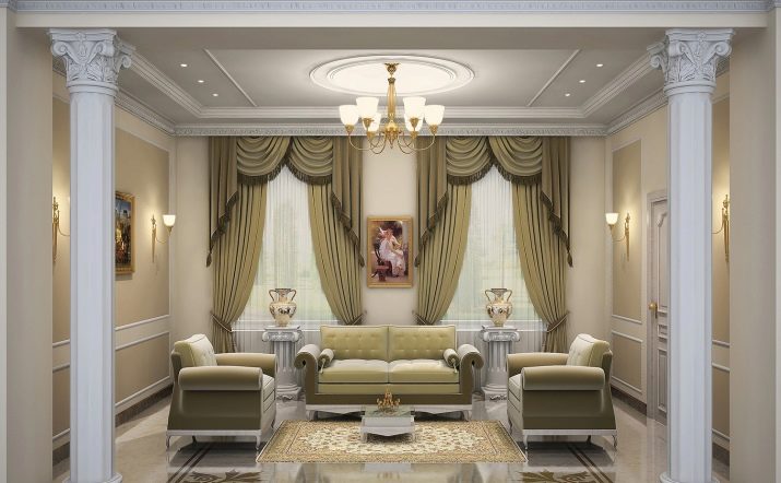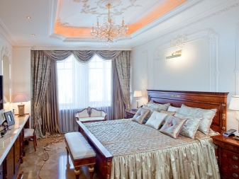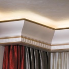 إذا قمت بإخفاء الكورنيش في مكانه المناسب ، فستتمكن من التركيز على سقف ممتد معقد متعدد المستويات. عدم وجود الإضاءة الخلفية ليس من قبيل الصدفة. في هذه المجموعة ، ليست الستائر هي الشيء الرئيسي على الإطلاق ، وقد أكد المصمم ذلك بمهارة من خلال اختيار الكورنيش المناسب.