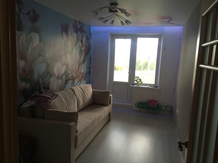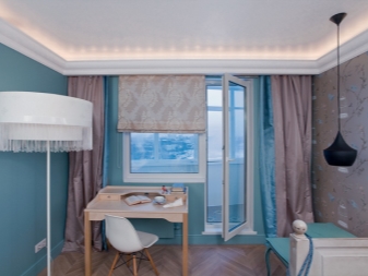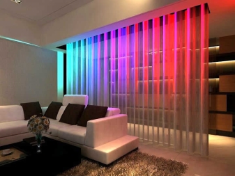 يتيح لك استخدام الإضاءة المدمجة تغيير المظهر العام للغرفة تمامًا ، فقط عن طريق تشغيل أو إيقاف تشغيل مصابيح LED الموجودة فوق الستائر. يعد هذا الخيار رائعًا لتزيين الكورنيش فوق باب الشرفة ، مما يؤدي إلى تشتيت الانتباه عن النافذة غير المتناسبة. من خلال إخفاء الحامل ، قام المصمم بإثراء المظهر العام للغرفة..