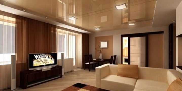 غالبًا ما يستخدم المصممون حلولًا غير تافهة. يتم إنشاء مكانة بسبب الاختلافات في مستويات السقف ، والحزمة التي تغطيها تخلق المستوى الأدنى من الهيكل. وهكذا ، حقق المصمم هدفين في وقت واحد: أخفى الكورنيش وترك السقف لا يزال عالياً. يخلق الطلاء اللامع في منتصف السقف وهمًا بارتفاع أكبر.