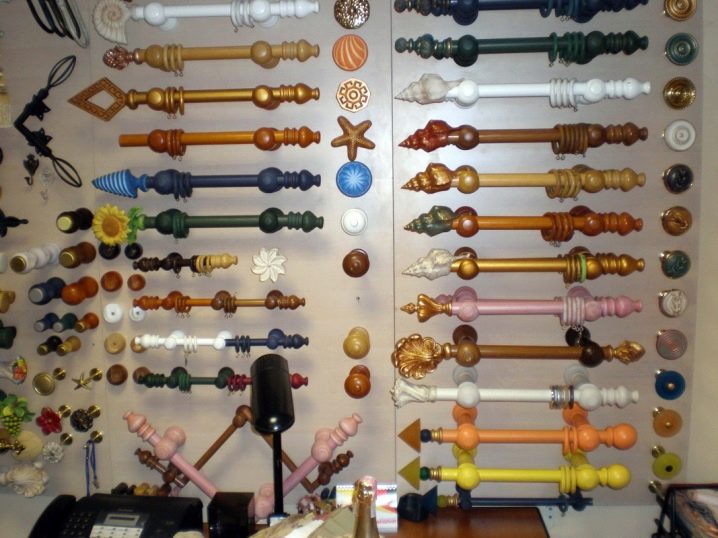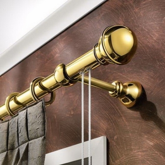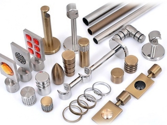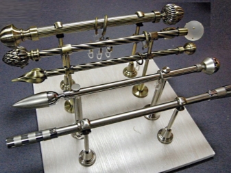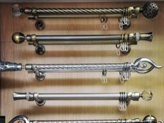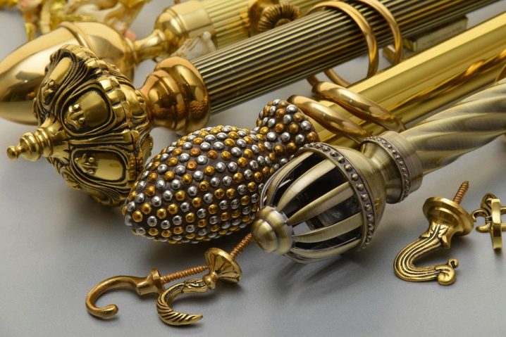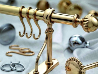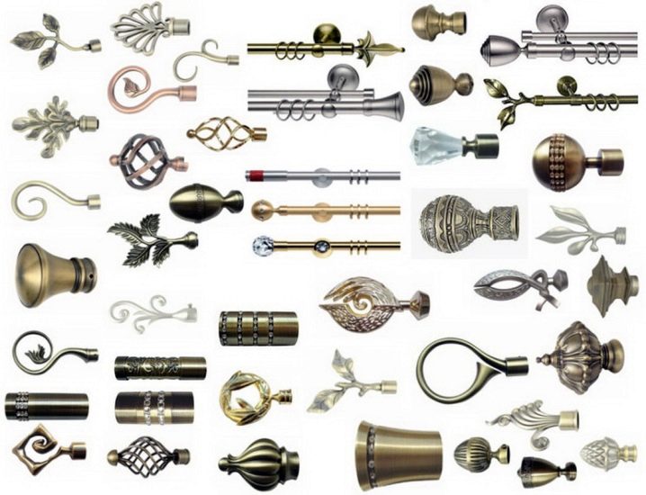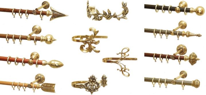 تركيبات مختلفة مطلوبة لتركيب وتزيين قضبان الستائر. اعتمادًا على النوع والمواد ، يمكن أن تكون هذه الأقواس والمزالج والملحقات في شكل نصائح أو حوامل أو مسكات. يتم توفير عناصر دوارة للإطارات البلاستيكية ، والتي يمكن استخدامها أيضًا لتزيين الأطراف. يمكنك تعليق الستائر على مثل هذا الكورنيش باستخدام خطافات بلاستيكية عادية لمنعها من الانزلاق باستخدام سدادات بلاستيكية. يمكن إرفاق شريط رغيف زخرفي بالواجهة.
