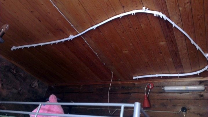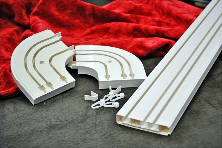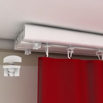 لتثبيت كورنيش السقف ، يجدر التفكير في أكبر عدد ممكن من الخيارات المختلفة في الصالونات. النوع الميسور التكلفة والأكثر تكلفة هو قضيب ستارة بلاستيكي على شكل إطار مسطح ، وهو عبارة عن ملف تعريف PVC مع وجود جروح في التجويف السفلي الذي يتحرك فيه عداء الخطاف.. يتم توصيل هذا الإطار بالسقف باستخدام مسامير.. عادة ما تكون مجهزة بعناصر محورية تسمح لك بترتيب الأطراف الدائرية للكورنيش..
