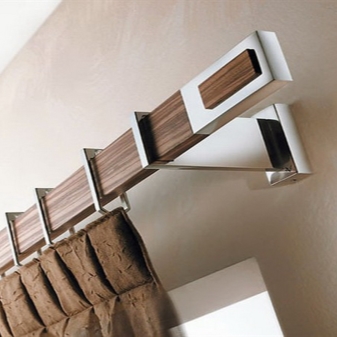 قضبان الستائر المعدنية هي التركيب الأكثر تطلبًا. بالنسبة لهم ، يجب عليك اختيار شريحة ، أي نقطة توقف خاصة للتعليق. يجب أن نتذكر أنه ليس كل قوس مناسب للتركيب على السقف ، يجب مناقشة هذه النقطة بشكل خاص مع البائع في الصالون. أيضًا ، عند اختيار شريحة ، من المهم مراعاة وزن الستائر. يمكن أن تكون الأقواس مفردة أو مزدوجة ، وفي الحالة الأخيرة ، يمكن وضع أفاريز عليها في نفس الوقت ، وهو مناسب لوضع الستائر والتول.