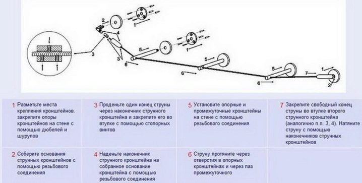 مرر الخيط الفولاذي عبر الفتحة الموجودة في الحامل المثبت واسحبه إلى الجانب الآخر من الأفاريز. هناك ، مررها عبر الفتحة مرة أخرى واجلبها إلى النقطة الأولى. ضع مشابك غسيل أو خطافات بطول كامل (حسب الحاجة). الآن قم بتأمين السلسلة ، وتجنب أي ارتخاء في السلسلة. يمكن تحقيق الشد المطلوب عن طريق تدوير مسمار خاص.