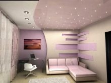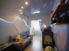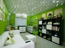 - في غرفة الأطفال ، غالبًا ما تخلق تأثير سماء الليل بمساعدة مصابيح LED صغيرة. يمكنك أيضًا عمل مخطط مجعد على شكل تجعيد الشعر على شكل حلزون أو وجه قطة..