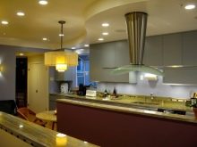 - في المطبخ ، يمكنك الجمع بين الأشكال الأساسية أو تقسيم المناطق. على سبيل المثال ، ضع دائرة فوق منطقة تناول الطعام ، وقم بمحاذاة الأضواء الكاشفة فوق سطح مطبخ العمل بحيث يكون هناك إضاءة كافية في وقت الطهي..