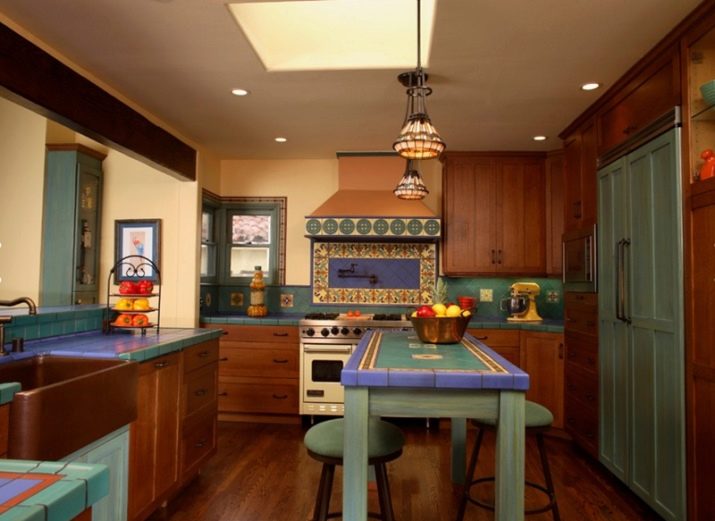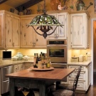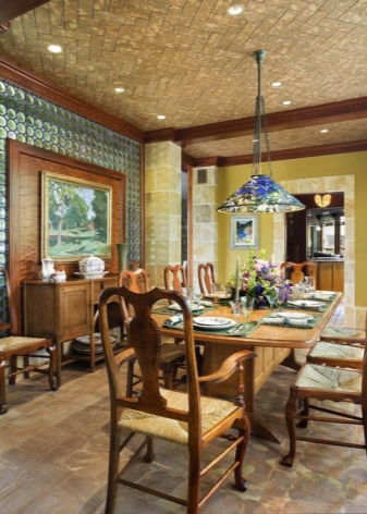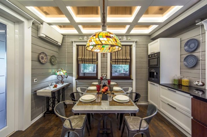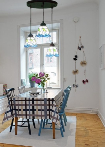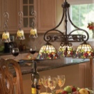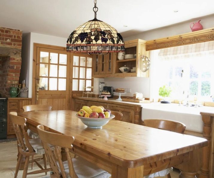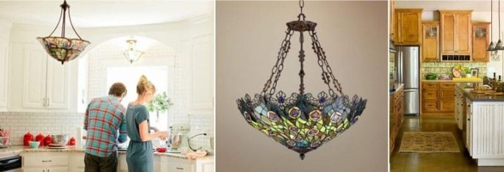 لا تخف من إضفاء التوابل على مطبخك بثريا على طراز Tiffany. في أغلب الأحيان ، يتم تعليق نماذج الزجاج الملون في منطقة تناول الطعام فوق الطاولة. بالطبع ، يجب أن يتناسب التصميم الداخلي مع الإضاءة المستقبلية..