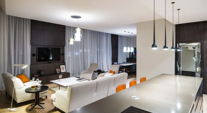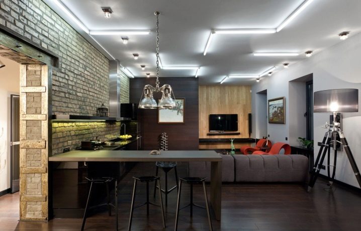 - النوع التالي المنتجات المعلقة. في الأساس ، يتم تركيب المصابيح على الهيكل الداعم. في أغلب الأحيان ، يتم استخدام هذه الأجهزة لتقسيم المناطق. باستخدام هذه الخيارات ، يمكنك إنشاء إضاءة محلية عالية الجودة دون عناء..