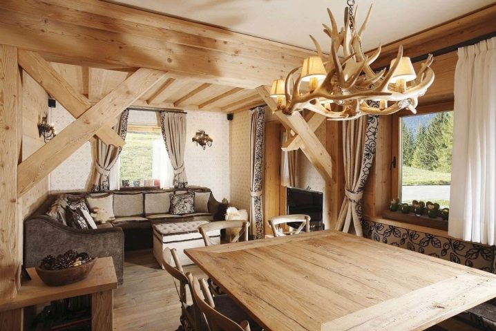- بعض الخيارات الأصلية هي منتجات على طراز الشاليه.. ينتمي هذا الاتجاه إلى أسلوب البلد ، لكن من الضروري الانتباه إلى بعض الاختلافات المميزة. في الأساس ، المصابيح مصنوعة من الخشب. ميزتها الرئيسية هي أن السطح يبدو خشنًا ، ويتم استخدام تفاصيل المعدن والزجاج للزينة. وتجدر الإشارة إلى أن هذا يضفي سحرًا خاصًا على تصميمها ويجعلها عصرية للغاية..
