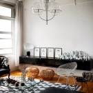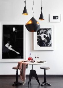 - خيارات سوداء أكثر تبريرًا ، حيث كانت النماذج السوداء هي التي كانت في الأسلوب في البداية. الهياكل المعدنية السوداء هي الكلاسيكية التي لا تتغير في الدور العلوي. يسمح لك اللون المحايد باختيار شكل غير عادي للهيكل أو إضافة تفاصيل مثيرة للاهتمام إليه. على سبيل المثال ، أحد الأمثلة هو ثريا على شكل قفص ، يوجد بداخلها ثريا أخرى ، ولكنها هذه المرة مصنوعة من الزجاج ، تكملها شمعدانات بمصابيح شموع كهربائية..