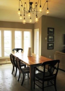 بالإضافة إلى الثريات الزجاجية القياسية ، يتم استخدام أواني زجاجية ذات أحجار كريستالية للكونياك أو زجاجات الويسكي الفارغة ذات الملصقات المحفوظة كظلال. يبدو أن مثل هذه الثريات تعلن موقفًا بسيطًا للغاية تجاه الحياة ، وغياب أي ملحقات ، كما تُظهر ، كما يقولون ، أن كل شيء سيكون مناسبًا للمنزل.