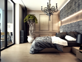 يعد استخدام مصابيح أرضية من نفس التصميم واللون ، ولكن بأشكال مختلفة ، مزيجًا مفيدًا للجميع. إن اختيار مثل هذا الخيار في تصميم غرفة النوم يبرر نفسه تمامًا ، مما يسمح في نفس الوقت بإنشاء إضاءة كافية والتأكيد على الثلاثية على الحائط.