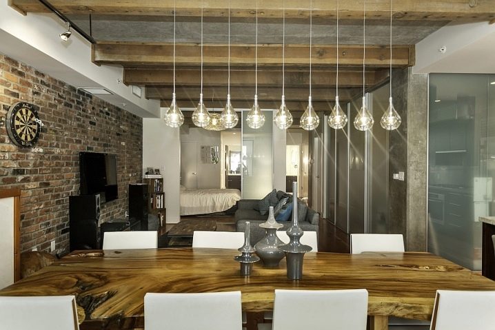 - ثريات زجاجية شفافة – موضوع منفصل للمناقشة. في أغلب الأحيان ، توجد نماذج أبهى مع العديد من التفاصيل الصغيرة ، وهي مناسبة للمسرح أكثر من الأماكن الصناعية. بالاقتران مع الجدران الخام والتفاصيل التكنولوجية البارزة ، يبدو الزجاج الشفاف فاخرًا.