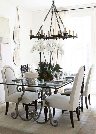- تعتبر غرفة الطعام الكبيرة ذات السقف العالي مثالية للهياكل الضخمة والمعقدة. أحيانًا تكون المصابيح متعددة المستويات الجميلة هي الخيار الأفضل هنا..