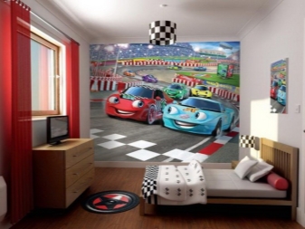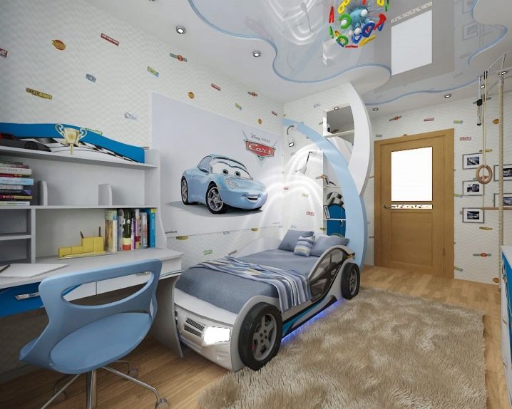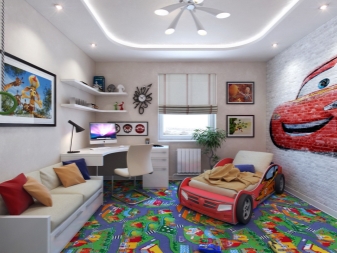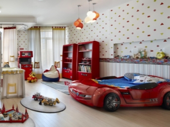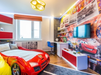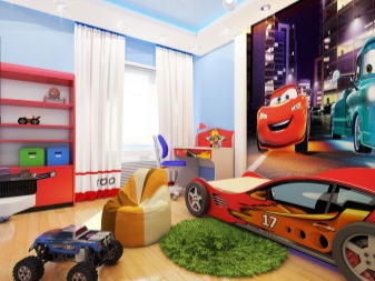 - تزيين غرفة نوم الصبي بأناقة الرسوم المتحركة الشهيرة “سيارات” أو بشكل عام ، قم بتصميمه كمرآب ، فكر في الخيارات الساطعة في شكل المصابيح الأمامية للسيارة أو الأضواء الكاشفة. خيار الميزانية هو شراء عاكس الضوء من القماش الذي يصور السيارات المفضلة للطفل.