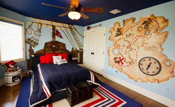 - كما هو الحال مع غرف صائد الكنوز الشاب, مخبأ القراصنة تحتاج إلى “تمييز” بشكل مناسب. عاكس الضوء مع خرائط الكنز أو مزين بأعلام سفن القراصنة ليس الخيار الأكثر إسرافًا حتى الآن. يمكنك حتى العثور على ثريا على شكل جمجمة كرتونية ذات عين واحدة. سيصبح المنظر مخيفًا بعض الشيء وقرصنًا جدًا..