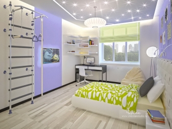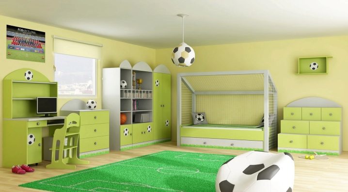 - إذا كان طفلك مشجع رياضي, مجموعة واسعة من الخيارات متاحة لك. اعتمادًا على اتجاهك الرياضي المفضل ، من المفيد تصميم الغرفة نفسها واختيار الإضاءة. لا يمكنك مفاجأة أي شخص بالثريات على شكل كرات ، ولكن إذا أضفت مثل هذا الهيكل ، على سبيل المثال ، بشبكة كرة السلة ، فسيكون التأثير أكثر إشراقًا..