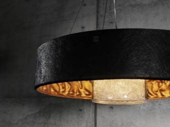 يمكن للمصممين أن يفاجئوا ليس فقط بشكل تركيبات الإضاءة ، ولكن أيضًا بالمواد. على سبيل المثال ، الثريا المعلقة من الأسمنت الفرعي مصنوعة من الخرسانة. نسيج الثريا مضلع ، يشبه إلى حد ما لحاء الشجرة.