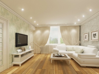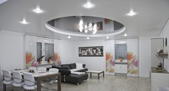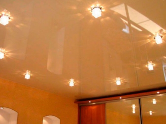 أصبح من المألوف الآن إبراز السقف حول محيط الغرفة ، لكن هذا ليس مناسبًا دائمًا. في بعض الأحيان يكون من الأفضل استبدال الإضاءة الشريطية المخفية بأضواء كاشفة LED ، خاصة إذا كانت الغرفة كبيرة. بهذه الطريقة يمكنك تحقيق مستوى متساوٍ من الإضاءة في كل زاوية..