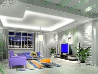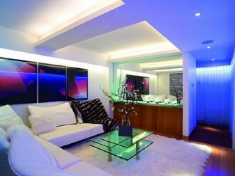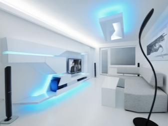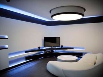 - للتكنولوجيا الحديثة والعالية يتميز استخدام الإضاءة الدائرية حول محيط الغرفة. يجب أن يكون لونه غير عادي: أرجواني وفيروزي وما إلى ذلك. ستؤكد تقنية مماثلة على الملء عالي التقنية للغرفة ، مع جعل السقف مركز التكوين بأكمله..