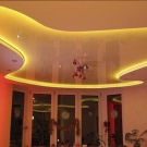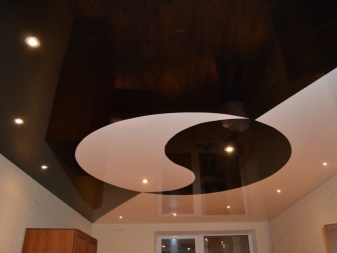 عادةً ما يتم تمييز المستوى السفلي على الجانبين بواسطة الأضواء الكاشفة. يمكن توجيهه من وسط الغرفة أو إلى المركز اعتمادًا على كيفية ترتيب المستويات. يلجأ العديد من المصممين إلى الحيلة التالية لتوسيع المساحة: يجعلون الجزء المركزي من السقف أعلى ولامعًا ، ويخفضونه قليلاً في الجوانب الجانبية غير اللامعة. وبالتالي ، فإن الإضاءة الخلفية باتجاه المركز ، والتي تنعكس قدر الإمكان من خلال الطلاء اللامع ، تجعل الغرفة مشرقة وعالية بشكل لا يصدق. يمكن لدرجة حرارة الضوء المحددة بشكل صحيح أن تجعل مثل هذا الهيكل مريحًا..