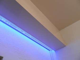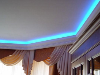 يلعب الكورنيش المضاء في إضاءة السقف دورًا مهمًا إلى حد ما ، خاصة عندما يتعلق الأمر بالإضاءة حول محيط الغرفة. يتيح لك هذا الاختيار من الإضاءة جعل الغرفة أكبر ، وتوسيعها ، مع التأكيد على تصميم النافذة.