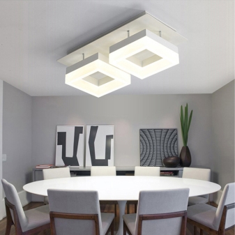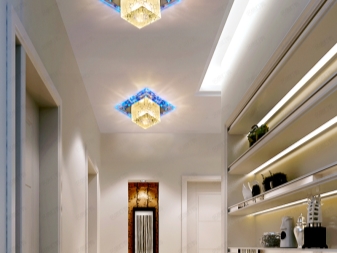 لتزيين شرفة المراقبة أو الممر ، يمكنك استخدام ثريات سقف مربعة مع مصابيح LED. اختر مواد متينة حتى لا يفقد مصدر الضوء الجودة بمرور الوقت.